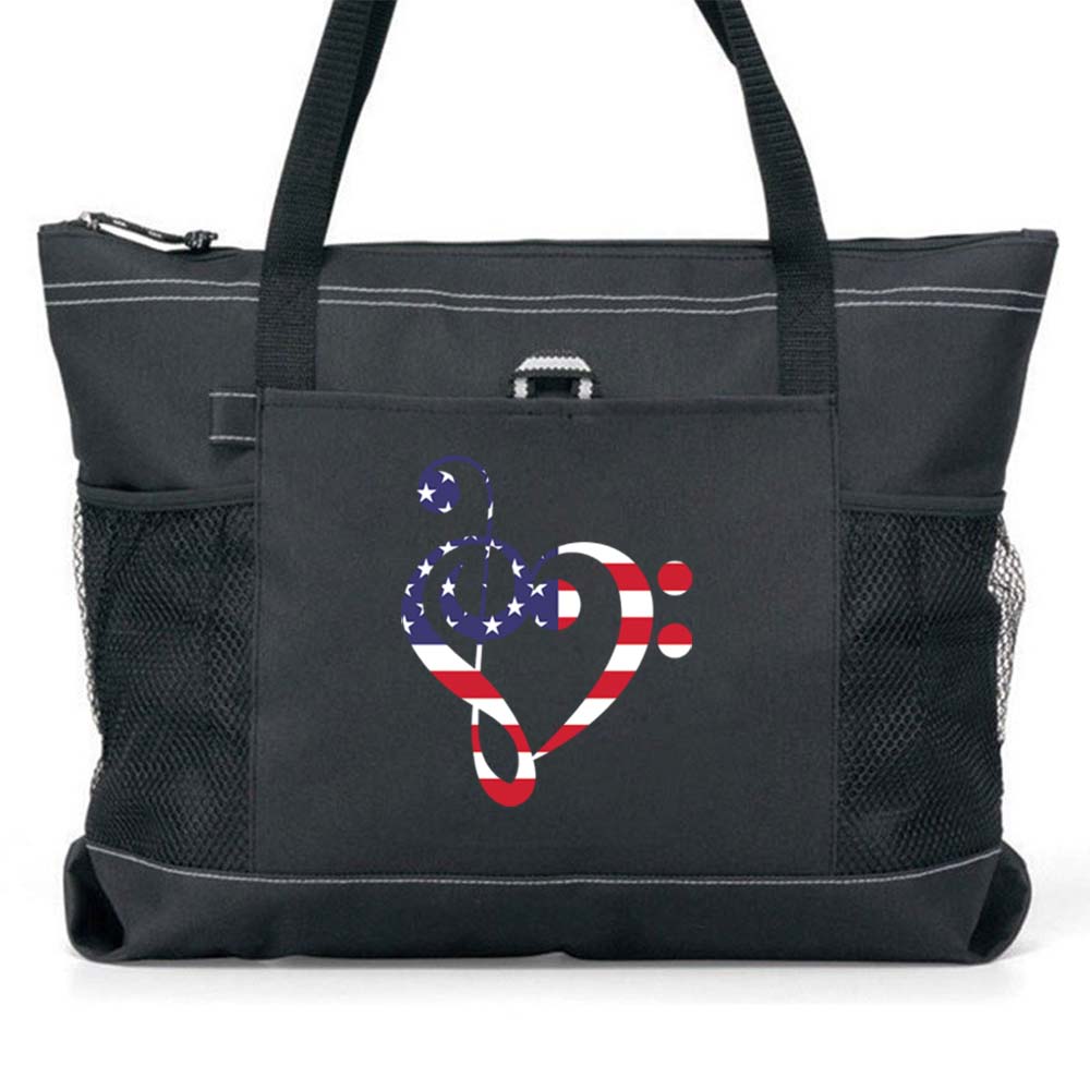 Show your love for music and patriotic style with our American Flag Clef Carry All Tote! Our versatile tote is perfect for carrying sheet music, books, and anything else you can fit in. With multiple designs to choose from, express yourself with our colorful and stylish bag. With a soft-sided zippered bag, you can take your music anywhere you go! Get yours now and make music your passion.
