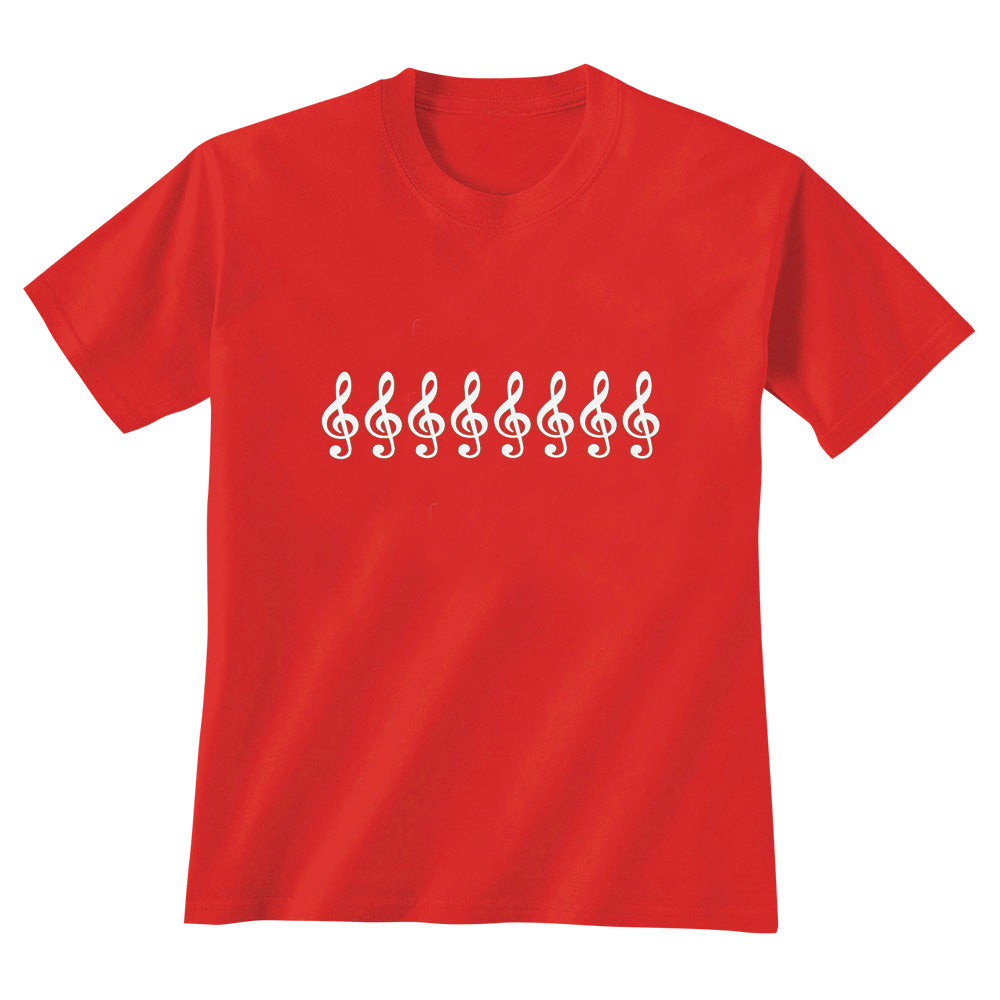 The universal symbol of the G Clef will be recognized wherever you go, even to the far corners of the world. Available in Black or Red T-Shirt.