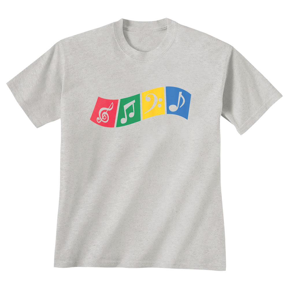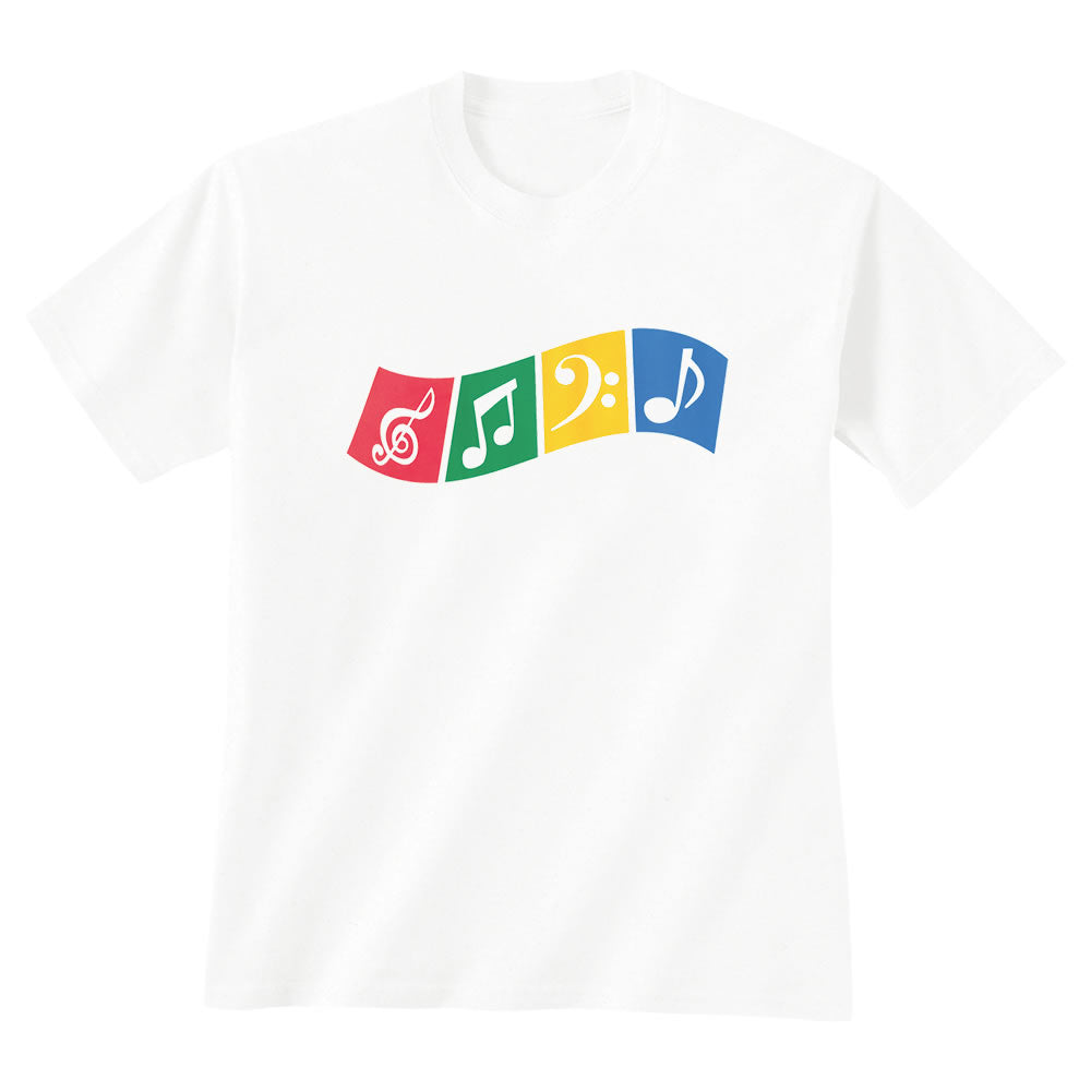 Notes and clefs are framed in blocks of bright bold color on this tee that suits music lovers of any genre.